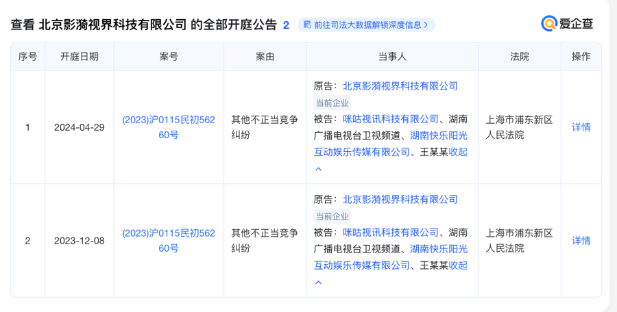 在网上大打“口水仗”的同时,北京影漪视界科技有限公司还将《运动者联盟》相关的咪咕视讯科技有限公司、湖南快乐阳光互动娱乐传媒有限公司、湖南广播电视台卫视频道、王濛四被告诉至浦东法院。