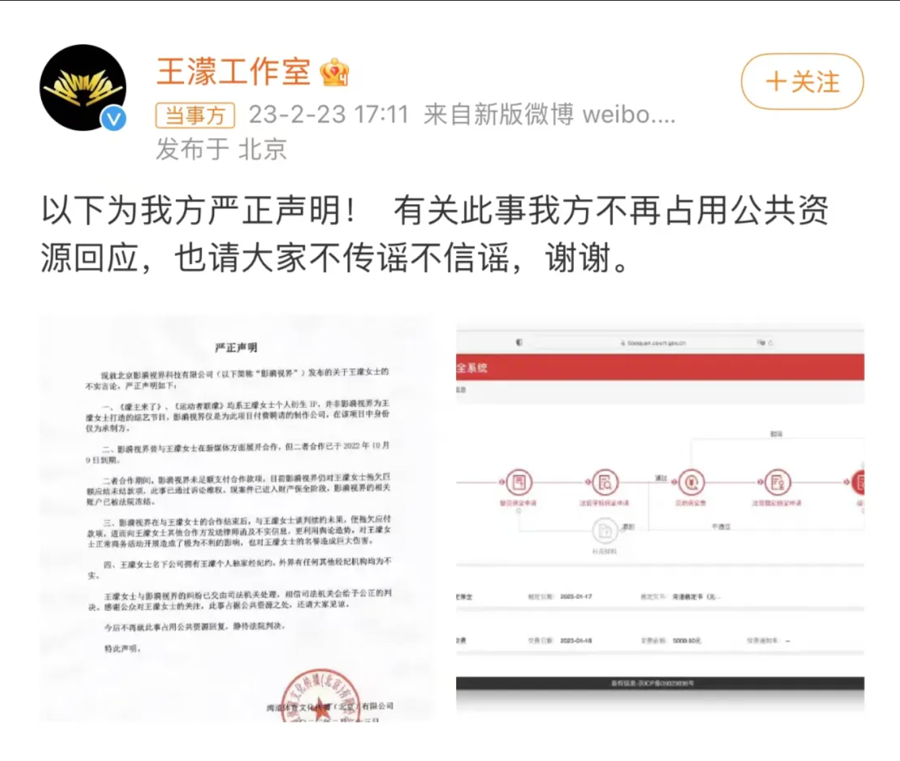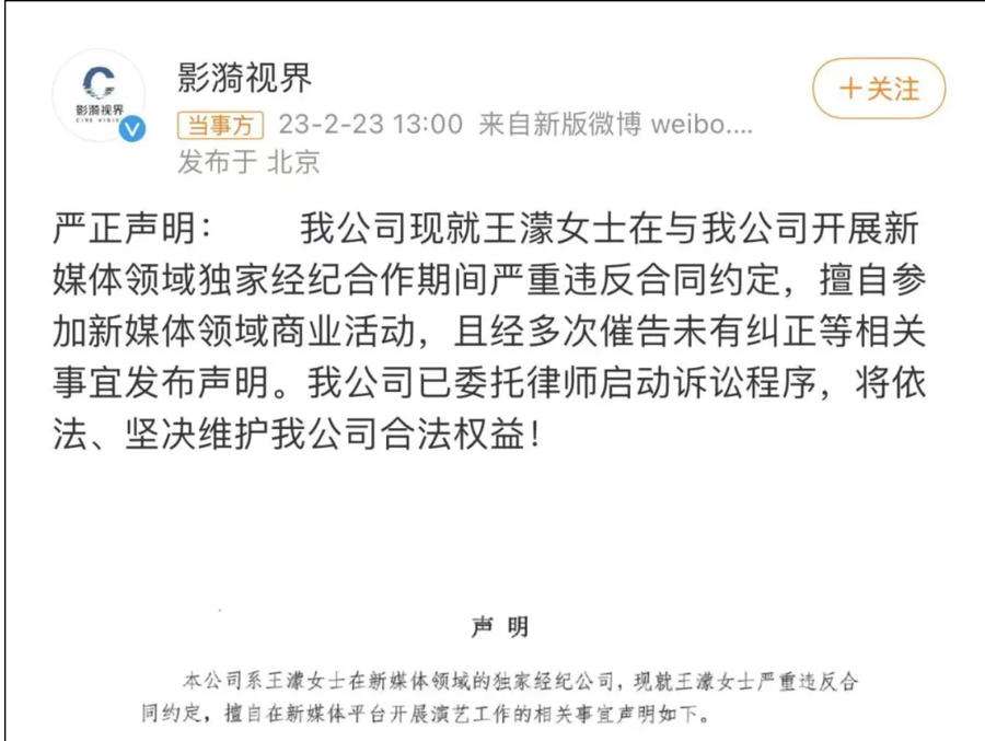 此前报道显示,2023年2月23日下午,北京影漪视界科技有限公司发表声明,自称为王濛在新媒体领域的独家经纪公司,因王濛在与其开展新媒体领域独家经纪合作期间严重违反合同约定,擅自参加新媒体领域商业活动,且经多次催告未有纠正,该公司已委托律师启动诉讼程序。