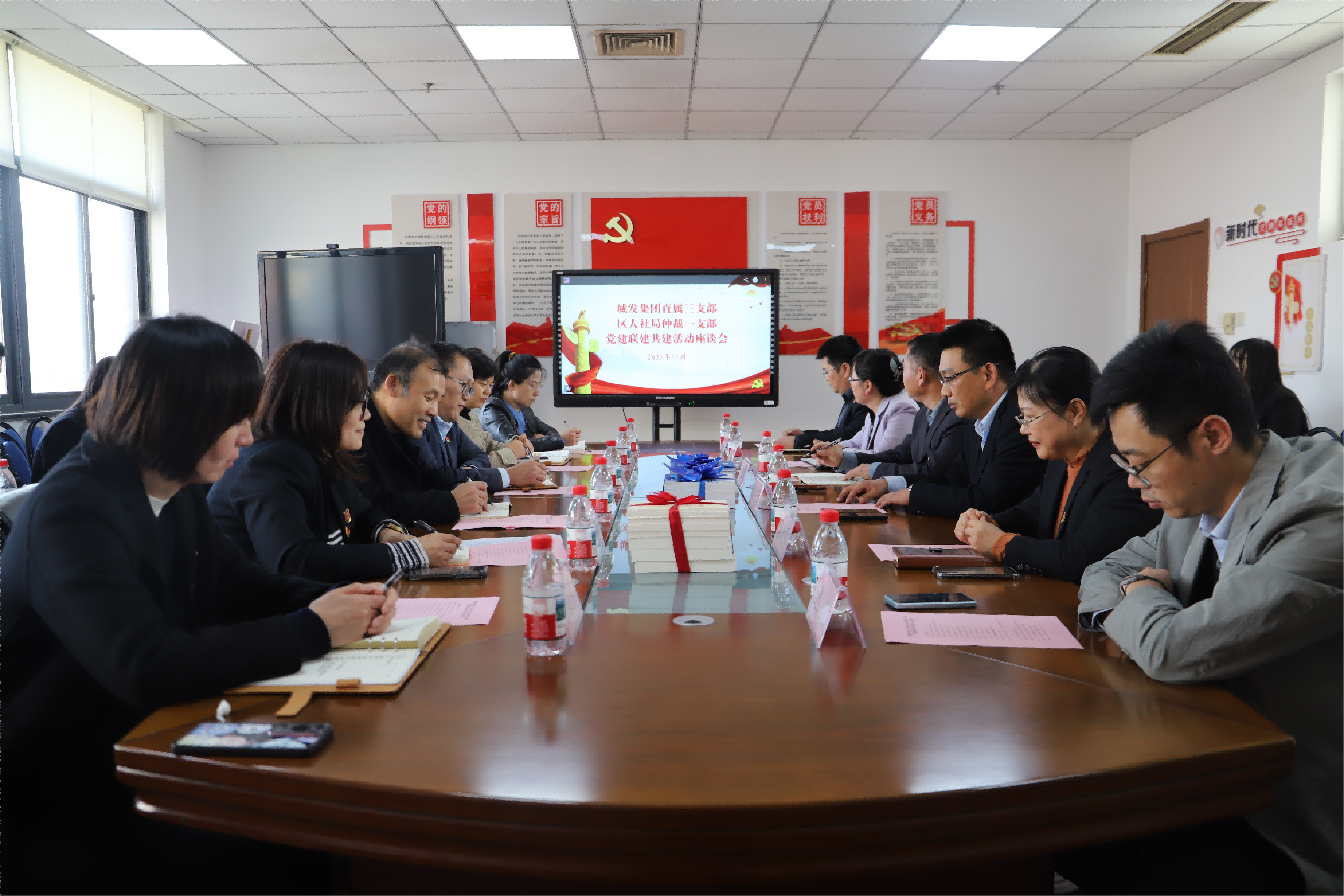 重温入党誓词后,双方党员共同参加了以“党建业务融合”为主题的联建共建座谈会,会议由区人社局四级调研员,劳动人事争议仲裁院党总支书记、院长张洪国主持,他首先对区劳动人事争议仲裁院的发展情况作了简要介绍并分享了以党建引领劳动仲裁规范化建设的成功经验。城发集团党委委员、纪委书记魏景法向区人社局介绍了集团在党建业务融合方面的实践探索。随后,双方就党建业务融合创新举措、建筑工程领域务工人员薪酬权益保障等问题进行了交流讨论。区人社局四级调研员薛维康表示,希望城发集团继续践行国企担当,在构建和谐劳动关系方面贡献新力量、展现新作为。会议还对“业务联办·服务上门”活动方案进行了研讨,计划整合集团人力、法务及区人社局相关科室的骨干力量,组建专项服务组,针对集团下属企业和重点项目用工管理需求,提供“直达式”政策解读、法律咨询及合规指导服务。座谈会后,双方互赠书籍,进一步丰富学习资源,夯实共建基础。