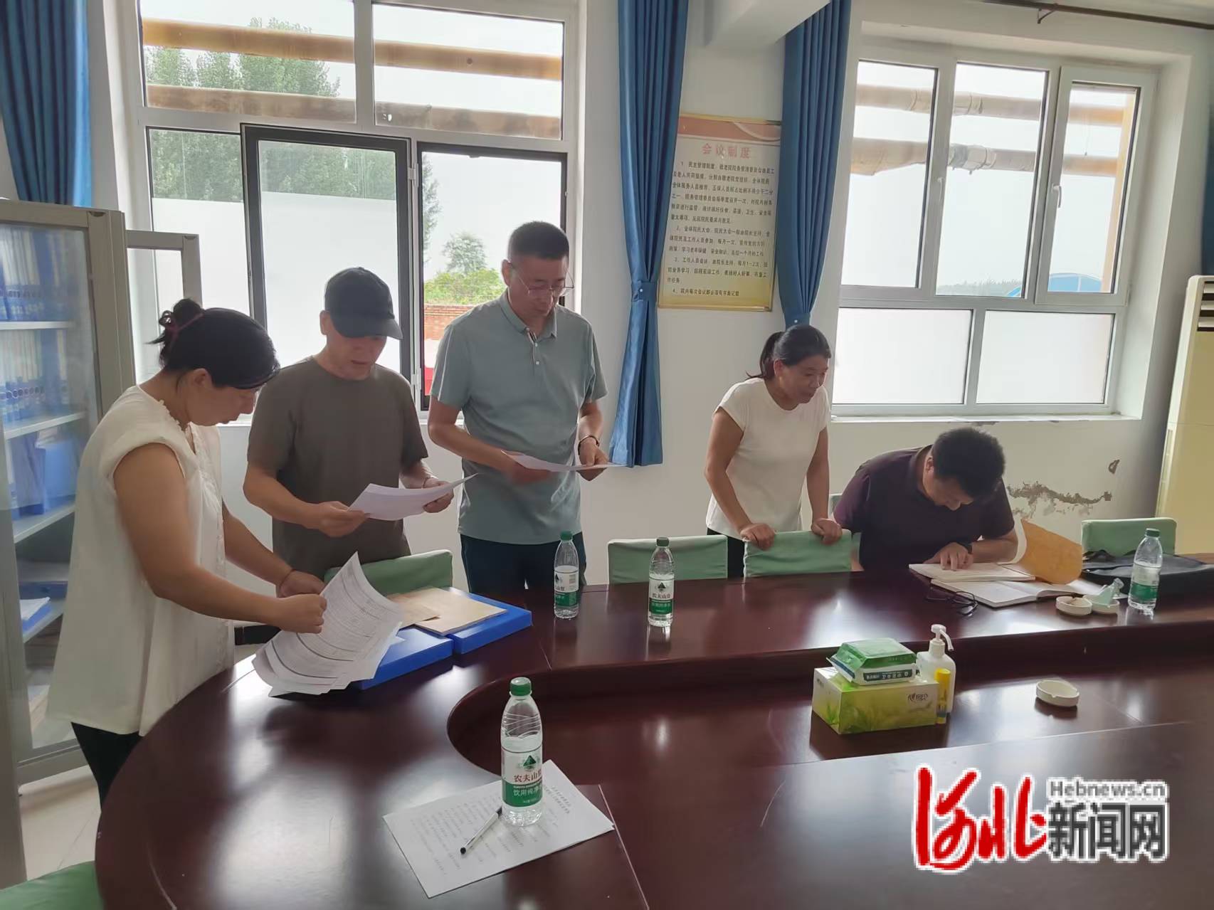 图为巡察组查阅敬老院药品入库出库账单,核查药品管理情况。