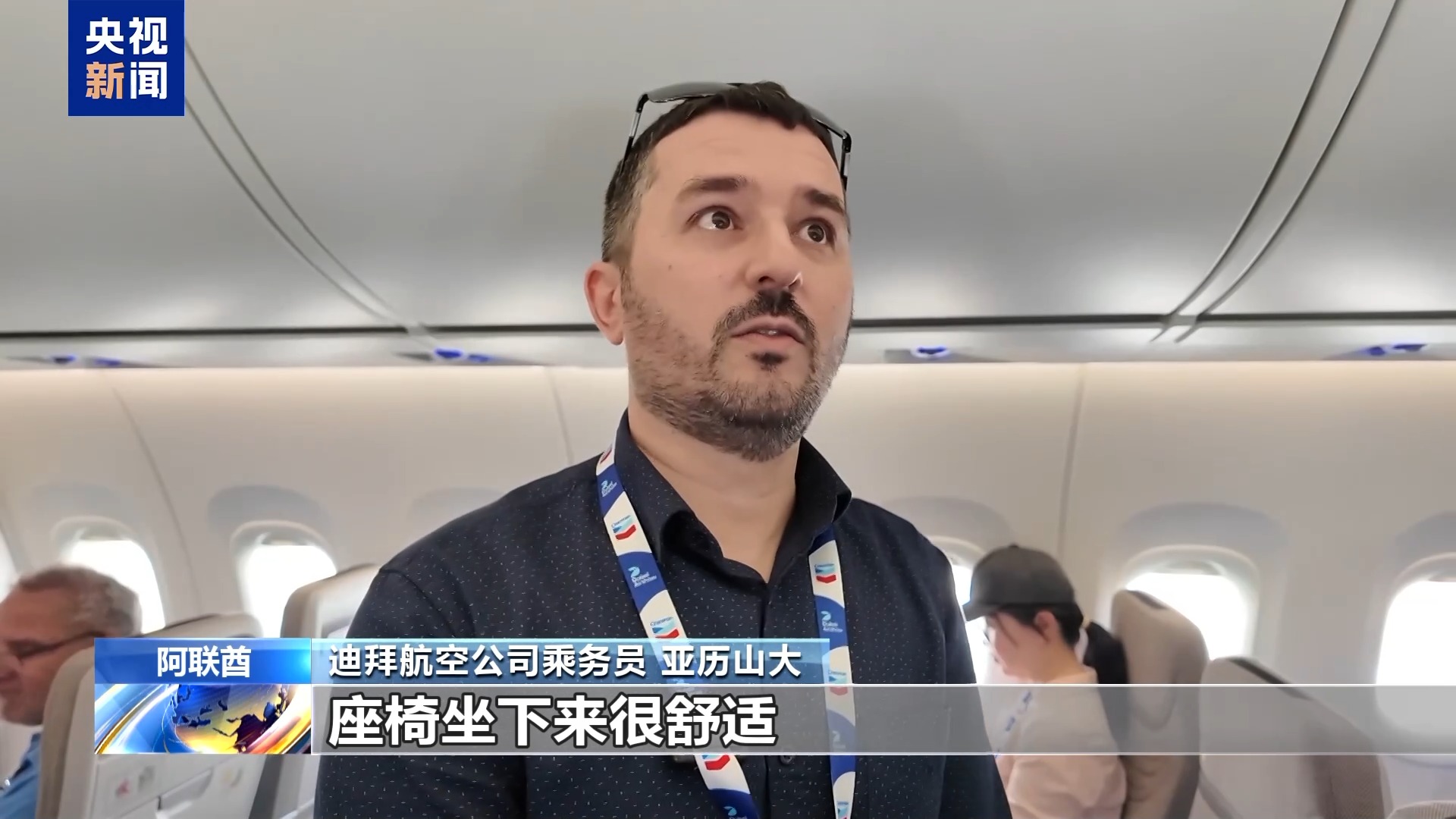 迪拜航空公司乘务员 亚历山大:座椅坐下来很舒适。这架飞机布局很好,空间很大。这是我第一次亲眼看到这架飞机,我对它很感兴趣。